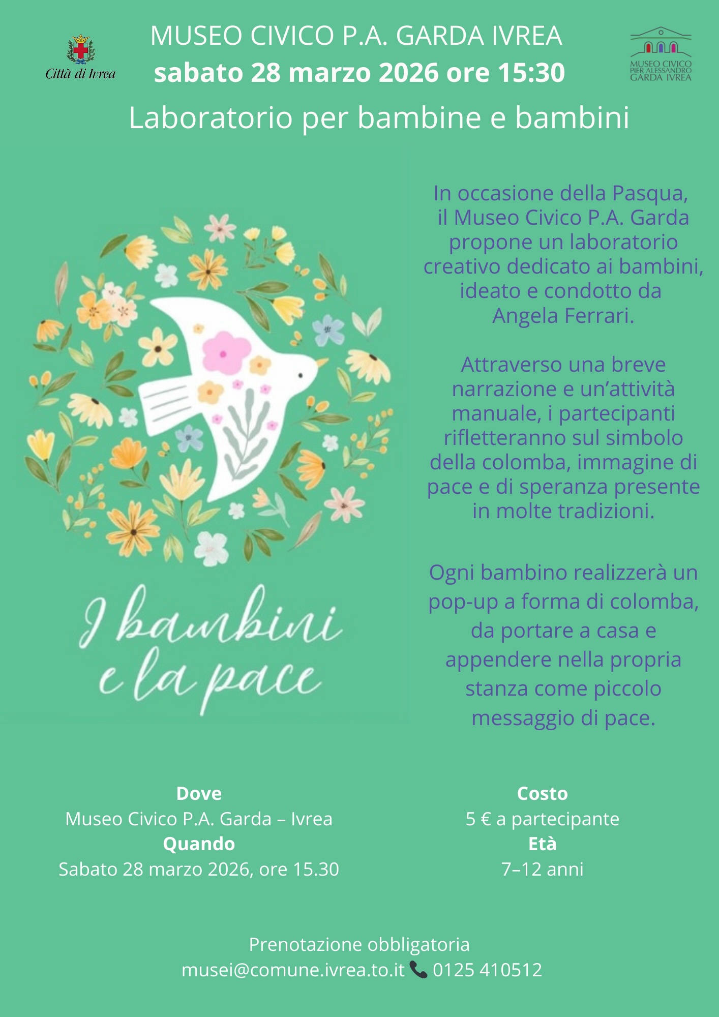 Il Museo Civico P.A. Garda invita bambine e bambini, dai 7 ai 12 anni, a partecipare al laboratorio creativo “I bambini e la pace”, in programma sabato 28 marzo 2026 alle ore 15:30 presso il museo.
